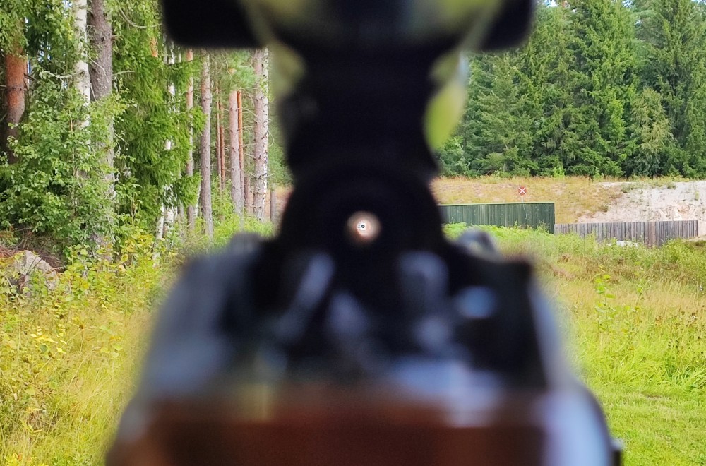 Innan du börjar skjuta så är det bra att kolla så att alla skruvar är ordentligt åtdragna och att pipan ligger fri från kolven, annars är risken stor att du skjuter bra men att geväret inte fungerar som tänkt. Efter det lägger jag bössan i skjutstödet, drar ut slutstycket så jag kan se genom pipan och så riktar jag in så jag tycker att tavlan jag ska skjuta på är i centrum av pipan.