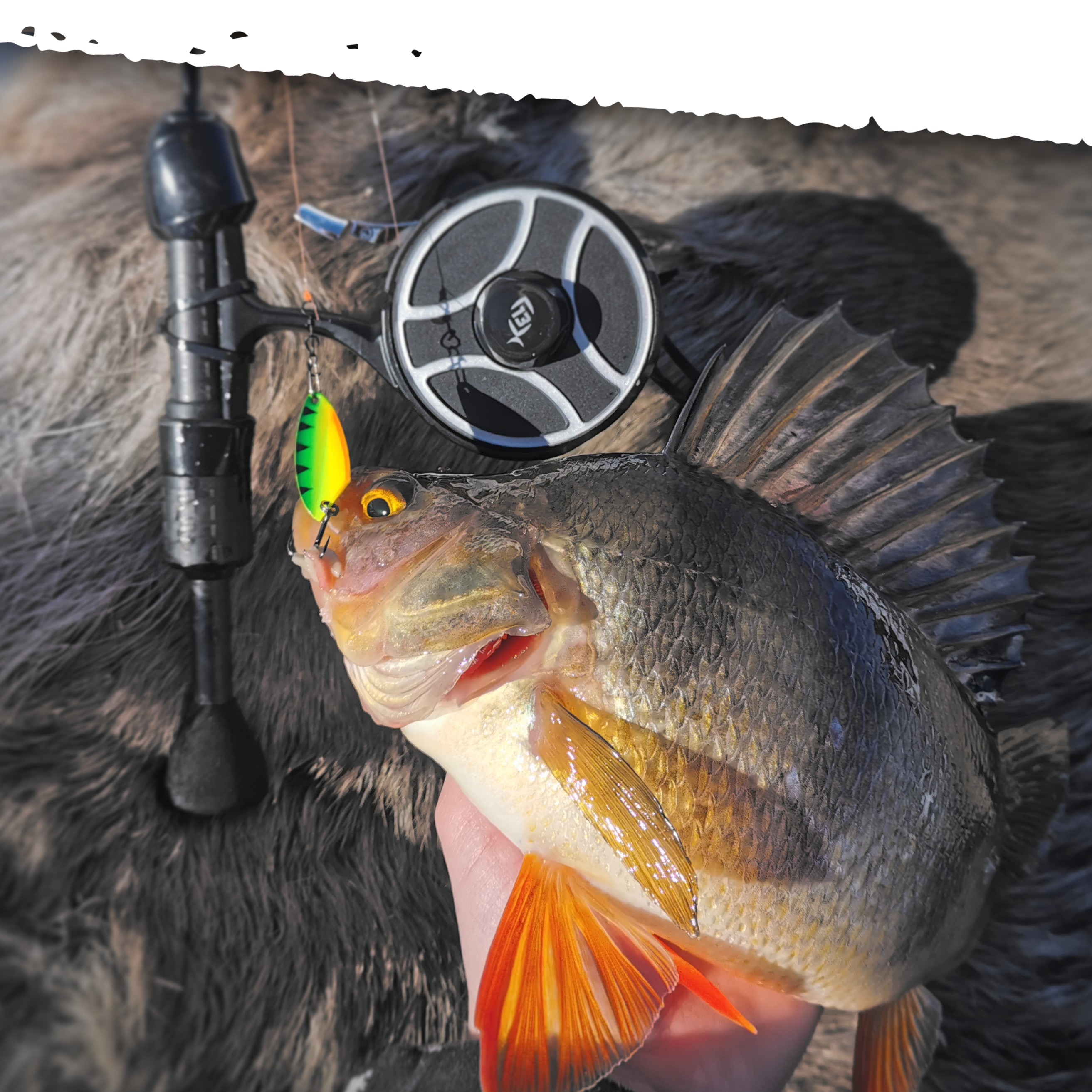 För rullen rekommenderar jag en haspelrulle eller en pimpelrulle av flugmodell med jämn slirbroms. En sådan rulle tar in lina snabbare och belastar linan mer jämnt vid drillning, vilket också möjliggör en tunnare lina. Jag använder själv gärna en nylonlina anpassad för vinterfiske i dimensionerna 0,18 eller 0,20 mm. Då får man bättre kontakt med betet och känner lättare även små napp. Tack vare den jämna slirbromsen belastas linan sällan med mer än något kilo, även om fisken skulle väga flera kilo.