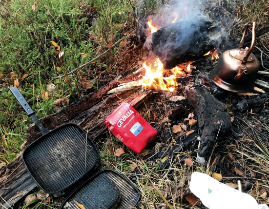 3) Vad finns i ryggsäcken när jag ger mig ut? - Kaffepanna, börjar man fuska och prioritera bort kaffekokningenär man en förlorad själ.
