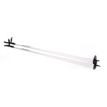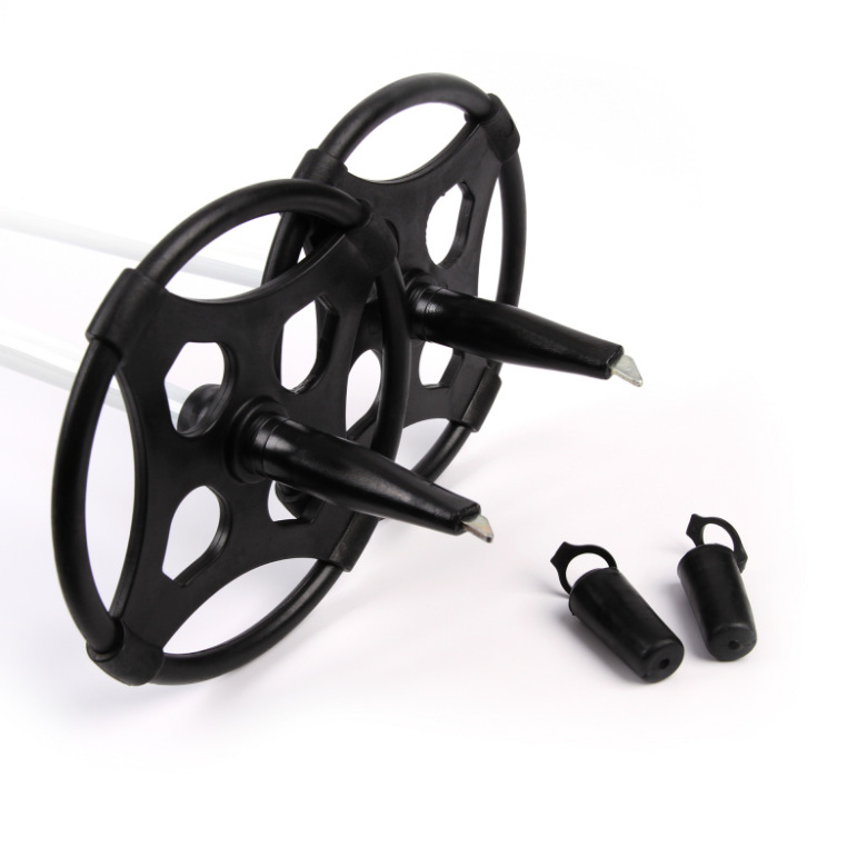 Handtagen på staven är också gjorda av plast och har justerbara remmar fästa på dem. Ändarna har metallspikar med färdiga gummipluggar för skydd. Vid behov kan trugan enkelt tas bort om du inte vill använda dem, så du kan använda skidstavarna för exempelvis stavgång.